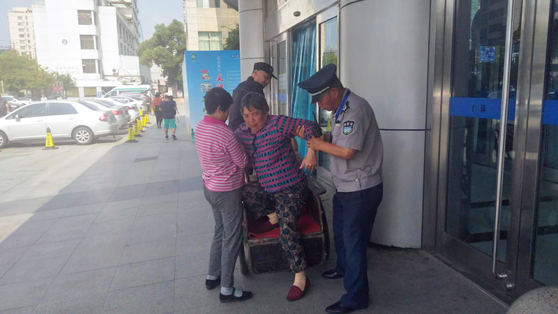 當(dāng)日盛玉林和張紅林負(fù)責(zé)中醫(yī)院門診大廳秩序維護工作,突然發(fā)現(xiàn)一位中年婦女騎著三輪車,車上躺坐著一名婦女,神色痛苦,盛玉林上前詢問得知因為患者腿腳不便的緣故,所以把三輪車推到中醫(yī)院大廳門口,于是盛玉林與張紅林主動上前攙扶腿腳不便患者下車并送進診室就診,患者對兩人熱心助人行為表示十分感謝。