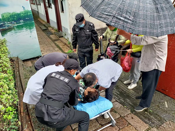 當(dāng)日,公司駐錦溪景區(qū)安保隊伍在進(jìn)行古鎮(zhèn)日常巡邏時,看到一名游客倒在地上,邊上家屬在呼救,于是他們立即上前詢問是否要幫忙,當(dāng)被家屬告知老人摔斷了腿起不來后,閆匡義、顏廷良和來成明確分工:由保安員閆匡義即刻撥打120尋求專業(yè)醫(yī)護(hù)人員;顏廷良在旁邊安撫游客,穩(wěn)定老人家屬的情緒;來成在維持周圍秩序,確保景區(qū)內(nèi)其他游客的正常游覽秩序。當(dāng)120救護(hù)車到達(dá)后,三人合力協(xié)助醫(yī)護(hù)人員把老人扶上救護(hù)車,使其獲得更加專業(yè)的治療。