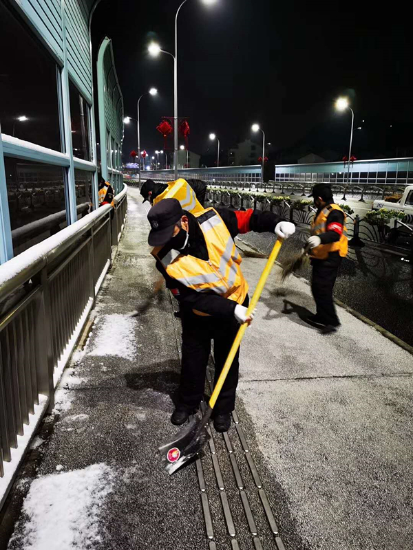 2月15日夜間,2020年昆山的第一場雪悄然而至,為了防止路面積雪對行人、車輛影響,公司結(jié)合業(yè)務(wù)板塊,迅速啟動應(yīng)急預(yù)案,組織亭林城管中隊、柏廬城管中隊、朝陽城管中隊30名城管協(xié)管員前往正陽橋、長虹大橋、玉峰大橋、繡衣大橋和南城河岸西城河岸景觀橋等橋梁、路面開展除冰掃雪行動。隊員按照應(yīng)急預(yù)案,明確責(zé)任,細(xì)化分工,重點對橋面行人通道與坡度路面進行集中清掃,防止積雪成冰。